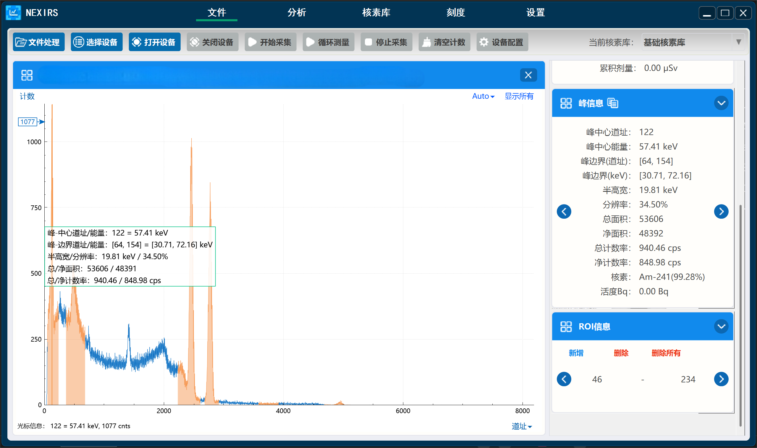 智能识别与计算:集成寻峰算法、活度计算功能,结合 ROI(感兴趣区)动态标记与调整,快速定位特征峰并关联核素信息。