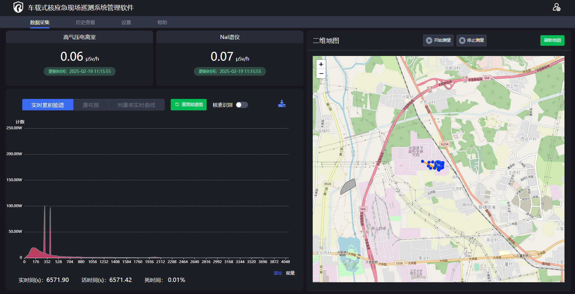 车载式核应急现场巡测系统包括车体改装、辐射测量模块、车载无线数据传输装置、北斗定位系统、车载电源等,用于 核应急期间随时随地快速准确地进行放射性监测和能谱分析,具有反应迅速、机动性高等特点,并将监测数据实时传至监 测软件,监测软件打包好传给应急通讯车,便于基站用于远程操作。